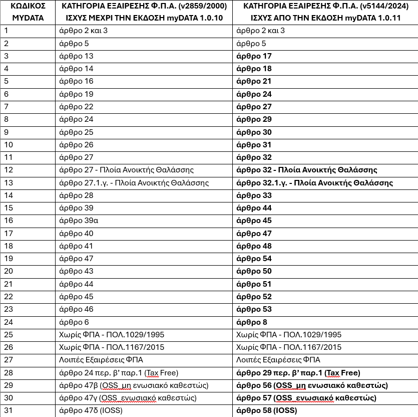 Υπάρχουν σύμφωνα με τον πίνακα 8.3 του τεχνικού εγχειριδίου της ΑΑΔΕ «myDATA API Documentation v1.0_official_upd.pdf», συνολικά 23 περιπτώσεις απαλλαγής ΦΠΑ, που τις εμφανίζει ο πίνακας 2, ο οποίος είναι αντίγραφο του ως άνω πίνακα 8.3.
