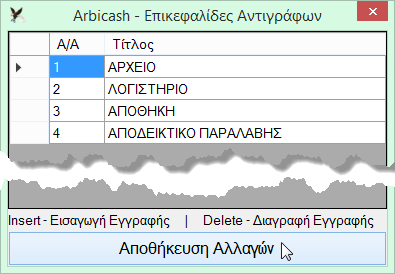 Τα αντίγραφα, θα πρέπει να τα ονομάσουμε ανάλογα με τη χρήση για την οποία προορίζονται. Προς τούτο κάνουμε κλικ στο . Θα εμφανιστεί η φόρμα που φαίνεται στην εικόνα 15.5. Με το πλήκτρο Insert εισάγετε γραμμές, για την εισαγωγή του τίτλου του κάθε αντιγράφου. Η ονομασία αυτή εκτυπώνεται πάνω αριστερά στο παραστατικό ενώ δεξιά εκτυπώνεται η λέξη ΑΝΤΙΓΡΑΦΟ. Αν θέλετε να αναγράφεται μόνο η λέξη ΑΝΤΙΓΡΑΦΟ, δώστε ως τίτλο αντιγράφου το κενό χαρακτήρα.