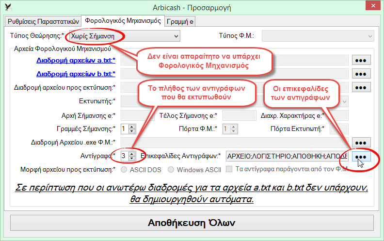 Ο αριθμός των αντιγράφων που εκτυπώνονται καθορίζεται στην καρτέλα «Φορολογικός Μηχανισμός», της φόρμας «Προσαρμογή», εικόνα 15.4.
