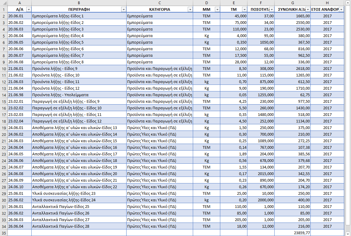 Για την απογραφή, χρησιμοποιήσαμε το αρχείο «2017 (E3 νέο) - Αποθήκη Λήξης 31-12-2017 Έναρξης 01-01-2018» το οποίο είναι βάσει των στοιχείων που αναφέρει ο «Πίνακας 6».