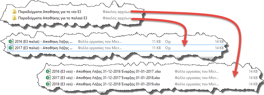 Τα υποδείγματα εισαγωγής της απογραφής της αποθήκης, τα οποία είναι αρχεία Excel είναι σε σε δύο υποφακέλους, ξεχωριστά για το παλιό και το νέο έντυπο Ε3, όπως φαίνεται στην εικόνα 142.2.