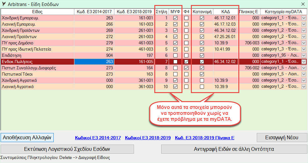 Όταν καταχωρείται/χαρακτηρίζεται ένα παραστατικό Εσόδων στα myDATA, μέσω του Arbitrans, o χαρακτηρισμός που αποστέλλεται στα myDATA είναι αυτός που έχετε καθορίσει στη φόρμα «Επεξεργασία Ειδών», εικόνα 18.1 [2].