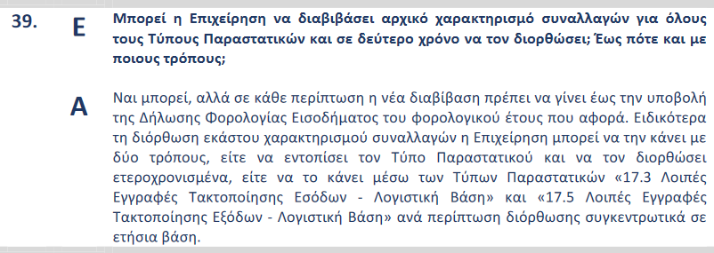 Η αλλαγή του Χαρακτηρισμού, επιτρέπεται. Σχετική είναι η Ερώτηση/Απάντηση 39 της ΑΑΔΕ, εικόνα 18.2, η οποία αναφέρει τα εξής: